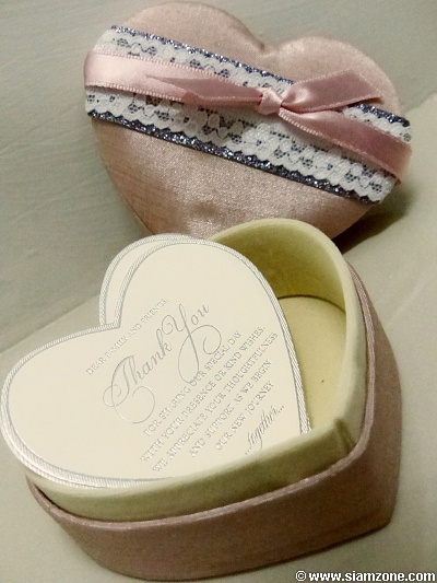 บรรยากาศหน้างานถูกจัดไว้คล้ายๆ สวนหย่อมร่มรื่น ประดับอย่างสวยงามด้วยต้นไม้ที่มีใบไม้สีชมพูสบายตา มีภาพถ่ายชุดแต่งงานของเจ้าบ่าวเจ้าสาวเป็นฉากหลัง แขกที่มาในงานนี้จะได้ของชำร่วยเป็นกล่องเอนกประสงค์สีชมพูใบเล็กรูปหัวใจ ด้านในบรรจุบัตรสีครีมรูปหัวใจ ล้อมกรอบด้วยสีเงิน มีข้อความแทนคำขอบคุณว่า "Dear family and friends, Thank you for sharing our special day with your presence or kind wishes. We appreciate your thoughtfulness and support as we begin our new journey together."