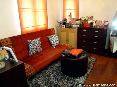 "สไตล์การตกแต่งก็เน้นโทนสีน้ำตาลให้บ้านดูอบอุ่นมากกว่าค่ะ คือไม่ได้เน้นแนวโมเดิร์นหรืออะไร แล้วก็คือเฟอร์นิเจอร์ในบ้านเราจะทยอยตกแต่งเข้ามาเรื่อยๆ ตอนแรกของจะน้อยก่อน แล้วคุณแม่ก็จะอันนู้นอันนี้เข้ามาตกแต่งเรื่อยๆ แต่ว่าคือโทนส่วนใหญ่จะเป็นโทนสีน้ำตาล ที่ทำให้บ้านดูอบอุ่นมากกว่าค่ะ"