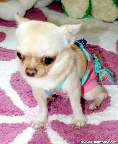"มี 3 ตัว ตัวใหญ่เป็นชิสุผสมพุดเดิ้ลค่ะ แต่ออกมาใหญ่จนนึกว่าจะเป็นโกลเดนฯ แล้วขนเหมือนโกลเดนฯ ด้วย ขนสีทอง ชื่อกุชชี่ค่ะ อายุประมาณ 2-3 ปี ตัวต่อมาก็กระป๋องเบียร์ ประมาณปีหนึ่ง พันธุ์ปอมเมอเรเนียน จริงๆ แล้วขนจะยาวๆ ฟูๆ แต่วิ่งซน ขนก็เลยเป็นสังกะตัง ก็เลยต้องตัด น้องคาร่ามาเลี้ยงเกือบครึ่งปี"