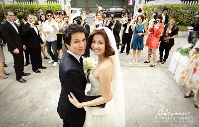 บรรยากาศในงานฉลองมงคลสมรสประดับประดาด้วยดอกไม้สีขาว สำหรับของชำร่วยที่มอบให้กับผู้มาร่วมเป็นสักขีพยานรักของคนทั้งคู่ คือ ครีมบำรุงผิวที่ห้อยตัวอักษรย่อ เอ และ ดี โดยเวลาประมาณ 17.30 น. เอ๊ะ ควงแขน ดอม ให้สัมภาษณ์สื่อมวลชนถึงเวลาอันแสนสุขนี้ด้วยสีหน้าเปี่ยมรอยยิ้ม