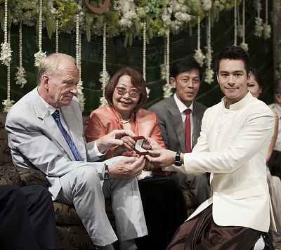 เวลา 07.00 น. ว่าที่เจ้าบ่าวและว่าที่เจ้าสาวพร้อมญาติผู้ใหญ่ได้ทำพิธีทางศาสนาตักบาตรพร้อมถวายอาหารพระหลังจากนั้นในเวลา 08.29 น. ได้เวลาตามฤกษ์อันเป็นมงคล ฝ่ายชายได้แห่ขบวนขันหมากตามธรรมเนียมพิธีไทยผนวกเข้ากับความเป็นร็อก โดยแห่ขบวนขันหมากด้วยรถมอเตอร์ไซค์ฮาเล่ย์ เดวิดสัน จำนวน 20 คัน และโห่นำขบวนขันหมากด้วยเพลงร็อก ในเวลา 09.09 น. ปีเตอร์ ได้สวมแหวนให้กับ พลอย พร้อมประกอบพิธีหลั่งน้ำพระพุทธมนต์ ในส่วนของสินสอดทองหมั้นนั้นเป็นเงินสด 1 ล้านบาท และทองคำน้ำหนัก 200 บาท ซึ่งนักร้องหนุ่มแอบเปรยว่าทุกอย่างที่มอบให้มาจากใจทั้งหมดที่มีและทำให้คู่ชีวิตยิ้มได้ก็รู้สึกดีใจมาก