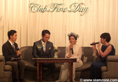 บรรยากาศภายในงานถูกเนรมิตให้เป็นรายการวิทยุ Club Fine Day แนะนำเพลงเน้นที่ท่อนจำบ่งบอกความรักของทั้งคู่ เริ่มจากฝ่ายหญิงที่ขอพูดถึงความรู้สึกก่อนที่จะแต่งงานด้วยเพลง "เลือกที่จะเหงา" ร้องโดย "ลูกหว้า - พิจิกา จิตตะปุตตะ" มาแทนความรู้สึกในตอนนั้น นอกจากนี้ยังมีเพลง "ยังอยากรู้" ที่ได้ ขลุ่ย และ ลูกหว้า มาร้อง และ "เจ้าสาวที่กลัวฝน" จากน้ำเสียงของ ลูกหว้า มาทางฝ่ายของเจ้าบ่าวขอพูดถึงความรู้สึกด้วยเพลง "ทำไมต้องรักเธอ" โดย ขลุ่ย และ ลูกหว้า